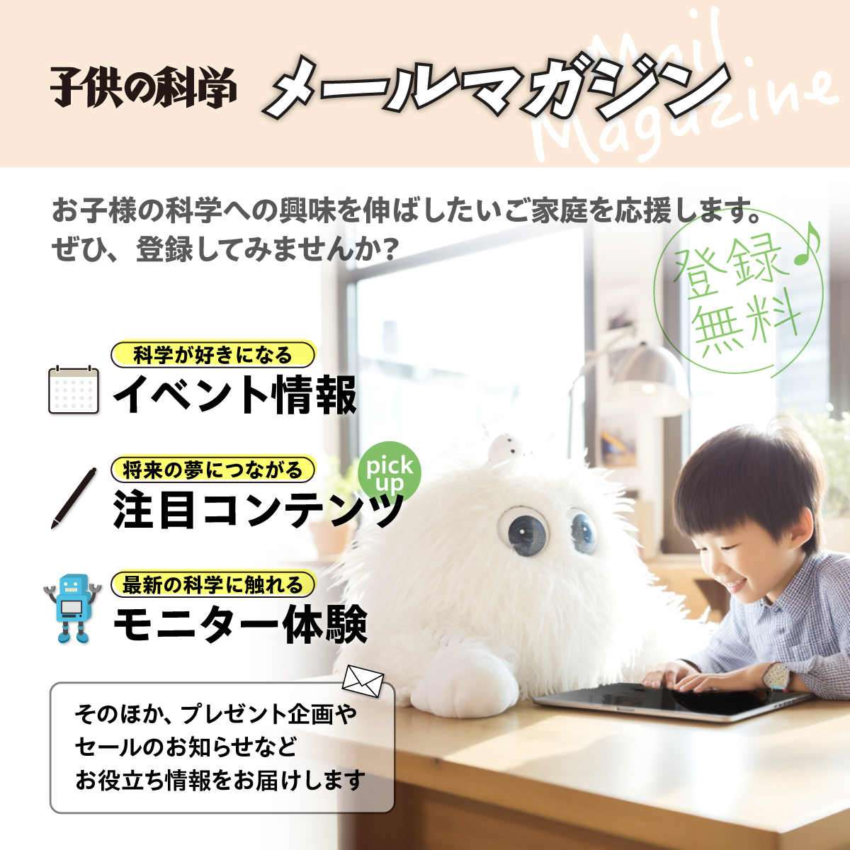 「子供の科学」主催のイベントをはじめ、科学に関するイベント情報をお届けします。実験や工作、プログラミングワークショップ、研究者にお話をうかがうオンライン講座など内容は多岐にわたります。メルマガではつねに最新情報をお知らせしますので、すぐに満席になる人気イベントの情報の見落としもなくなりますよ!