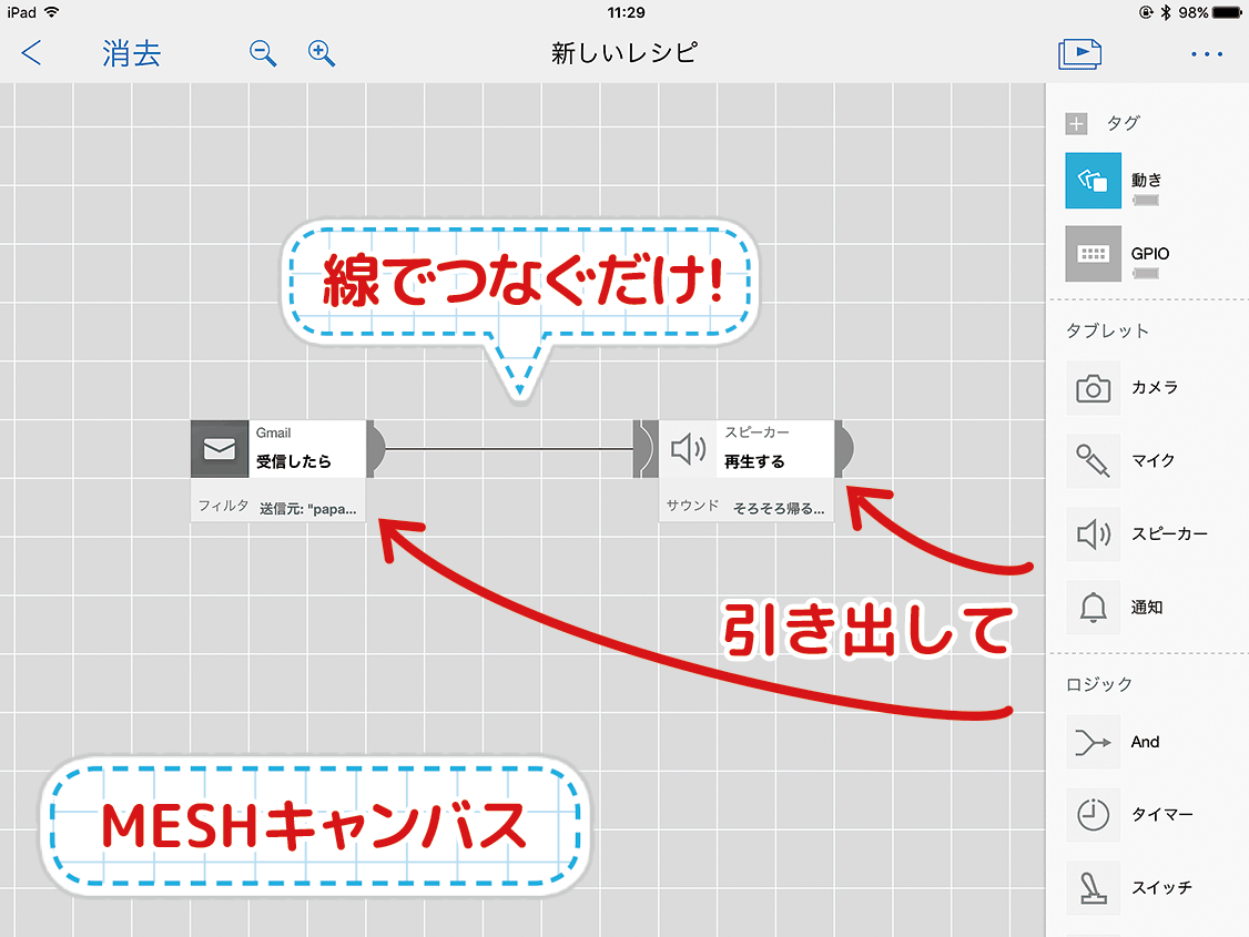 最初のレシピは“Gmailタグ”を使って、メールが届いたらメッセージを再生する、というものだ。MESHアプリだけでできるよ。