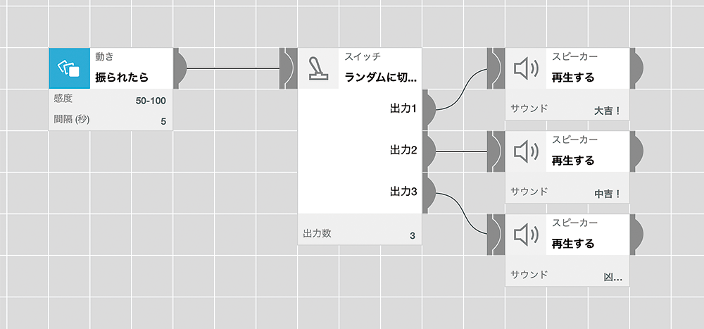 動きタグを振ると、ランダムに「大吉!」、「中吉!」、「凶…」など、あらかじめ録音しておいた結果メッセージを再生するように設定するだけ。