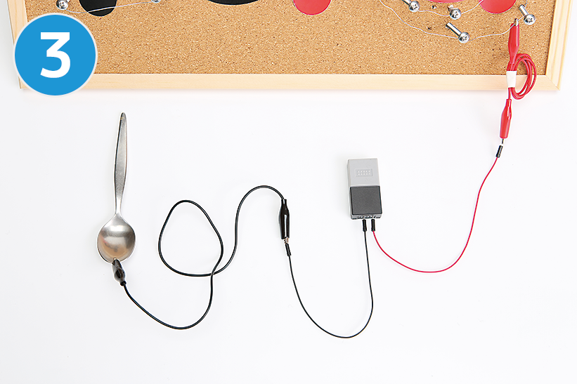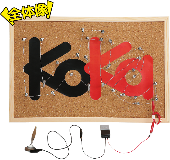ジャンパーワイヤーのもう一端にミノムシクリップをつなぐ。ミノムシクリップの先は、片方は手で持てるスプーンに、もう片方は迷路の針金につなぐ。