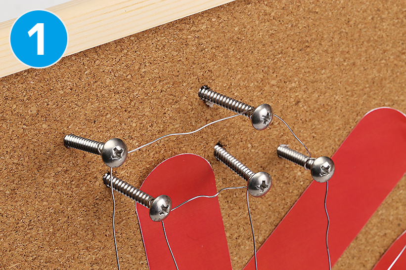 針金を使って迷路をつくる。コルクボードの上にネジやクギで柱を立てて、針金でつなぐといいぞ。針金は、一筆書きのように全部つながっていないとダメだよ。