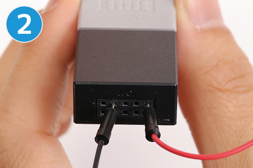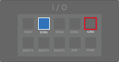 ジャンパーワイヤーの一端を、GPIOタグのグラウンド(GND)ピンとデジタル入力1(DIN1)ピンにつなぐ。抜けやすい場合はテープでとめておこう。(差し込む位置はI/Oというマークを上にしたときの上側の列の穴だよ)