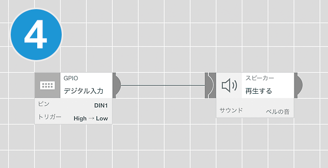 MESHアプリを開いて、GPIOタグとスピーカータグを図のようにつなぐ。GPIOタグをタップして、機能を「デジタル入力」に切り替え、ピンを「DIN1」、トリガーを「High → Low」に設定する。(図の赤く囲ったところは、もう1つのジャンパーワイヤーを差し込む位置を示している。アプリ画面上では何も表示されていないから注意)