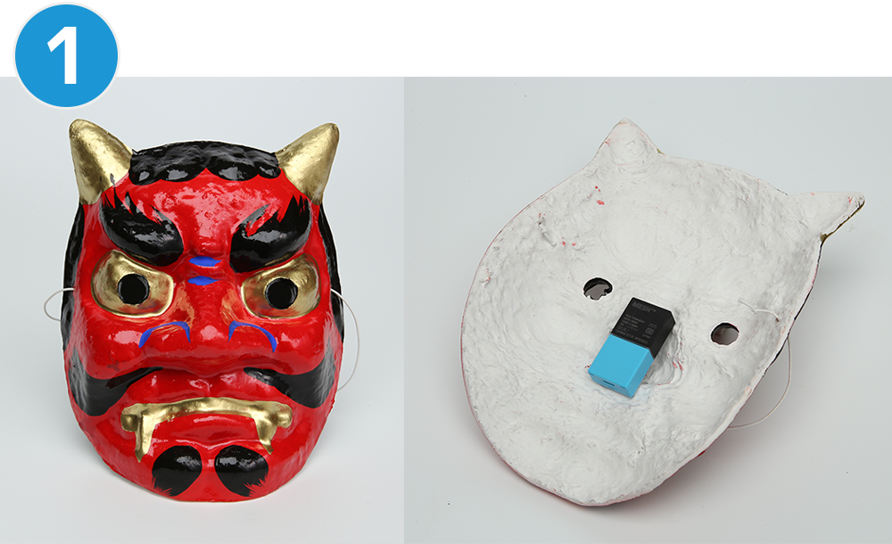節分の季節におすすめ!鬼のお面に豆を投げつけて、当たったらポイントが入る射的ゲームをつくろう。でも投げる力が強すぎて、お面を倒しちゃったらゲームオーバー、というのはどうかな。鬼のお面に“動きタグ”を貼り付けて、豆がぶつかったときの振動や、倒れたときの動きを感知するぞ。振動を感知したときと倒れたとき、それぞれ違う対応をするしくみにしよう。
