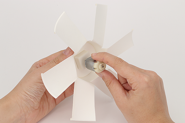 紙コップの中心に、両面テープで消しゴムを貼り付け、モーターの軸を消しゴムに差し込む。