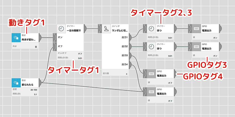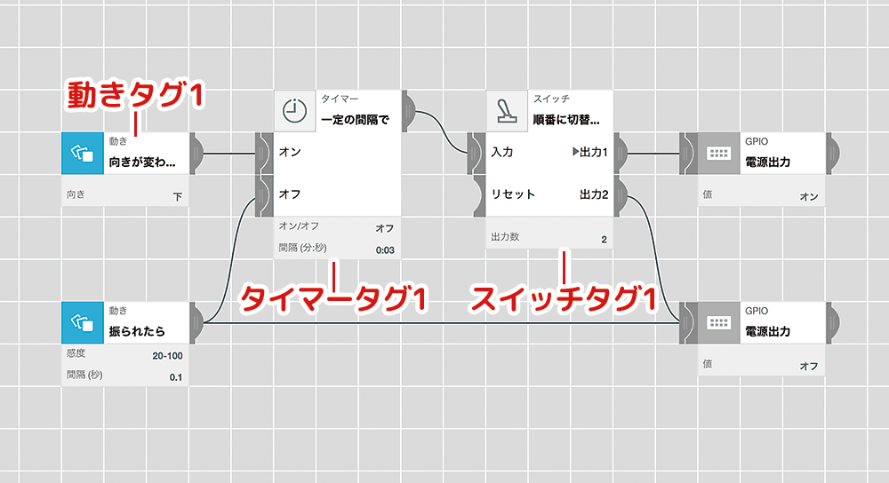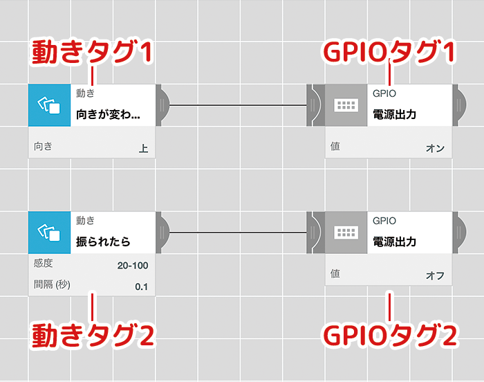●動きタグ2:「振られたら」を選択する ●GPIOタグ2:「電源出力」を選択して、値を「オフ」にする