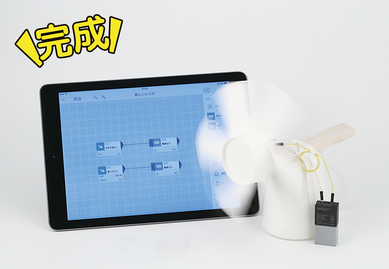 次に、プロペラの動きをコントロールしてみよう。まずは3秒ごとにプロペラが回ったり、止まったりする規則的な動きをつくるよ。MESHアプリの設定は次の通り。新たに使うタグは、「タイマー」と「スイッチ」だ。