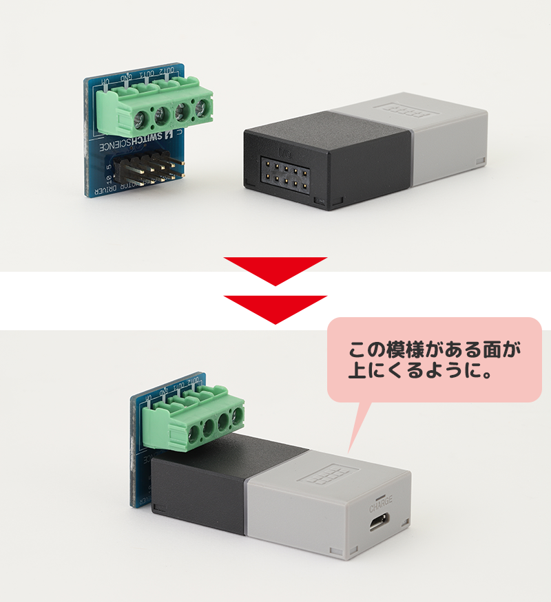 「MESH GPIOタグ用モータドライバ」の緑色のパーツが、GPIOタグの模様がある面にくるように差し込む。