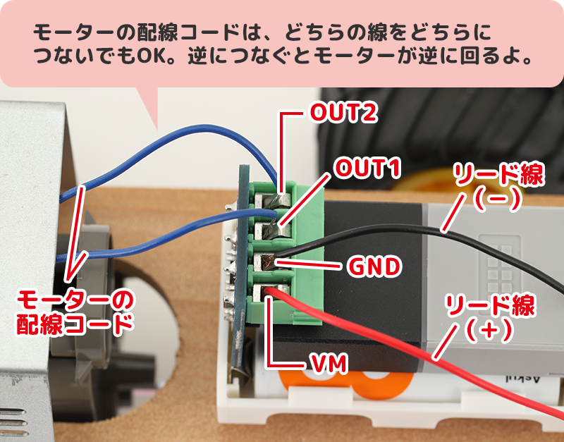 まず、モータドライバに、モーターの配線コードを接続する。モーターのコードを「OUT1」、「OUT2」に差し込み、精密ドライバー(マイナス)でねじ部分を回して固定しよう。次に、リード線をモータドライバに接続する。一方のリード線を「VM」、もう一方のリード線を「GND」に差し込み、先ほどと同じようにねじ部分を回して固定する。