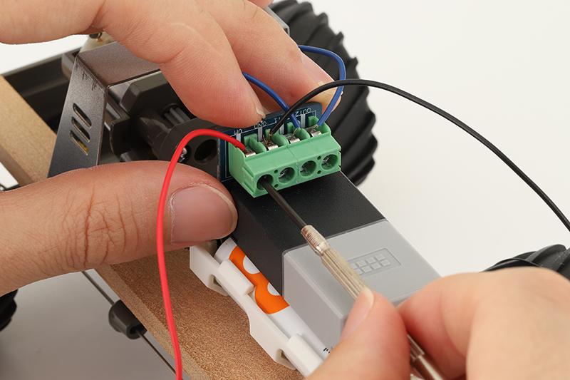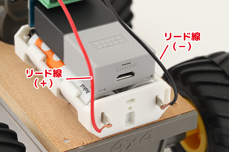 最後に、電池ボックスに、リード線を接続する。+のリード線を電池ボックスの+に、-のリード線を-に接続しよう。