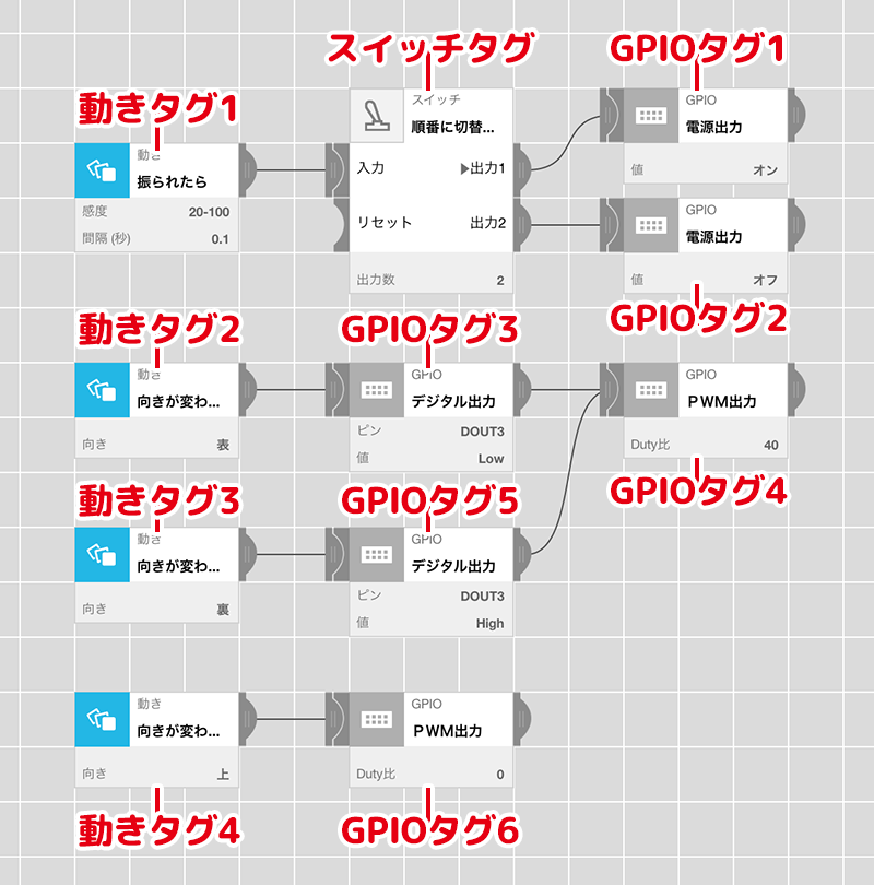 ●GPIOタグ1:「電源出力」を選択して、値を「オン」にする。