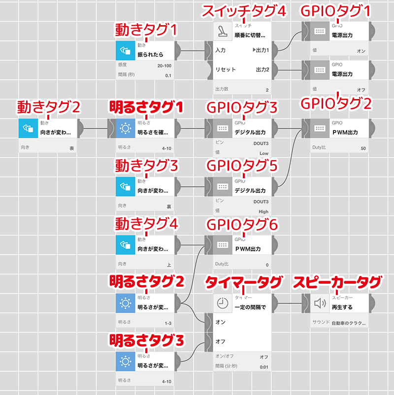 MESHアプリを開き、図のようにタグを配置する。今回はレシピその11(10月号)に少し付け加えるだけだよ。太字になっているところが、今回追加するタグだ。