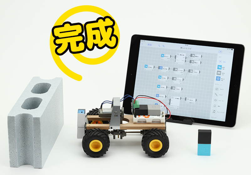 最近、自動運転車が話題だね。人や車を検知して自動で止まるなんて、もはや当たり前になっちゃった。そこで、レシピその11(10月号)でつくったMESHカーも、障害物の前に来たら自動で止まるようにパワーアップさせちゃうゾ!