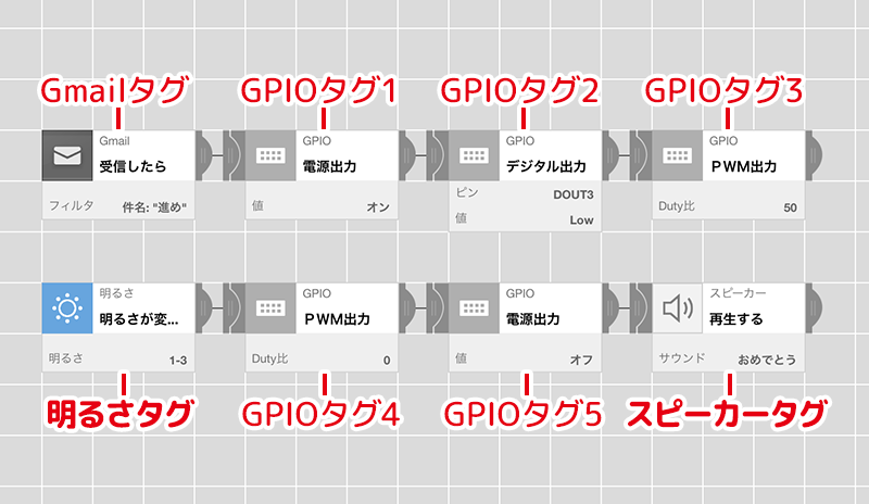 MESHアプリを開き、図のようにタグを変更する。太字になっているところが、レシピその13から変更するタグだ。