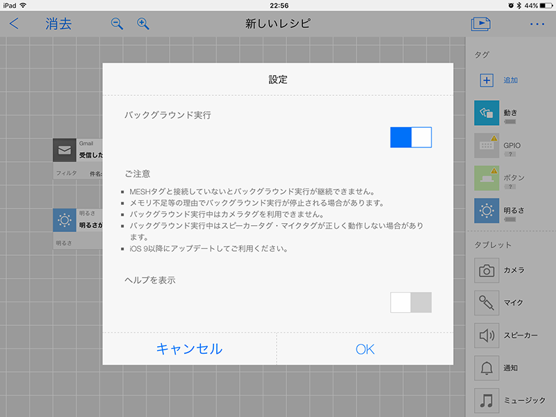 次に、タブレットがスリープ状態でも動作するように、右上の「…」ボタンをタップして、「設定」の「バックグラウンド実行」をオンにする。これで、作成したレシピの画面のままホームボタンを押してMESHアプリを閉じれば、スリープ状態でもMESHレシピが動作するよ。