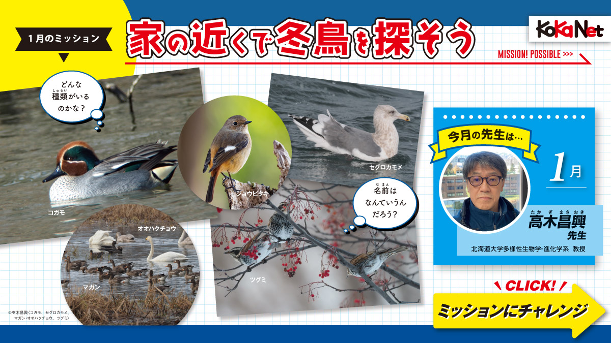 子供の科学2023年1月号別冊付録「科学ミッションカレンダー」1月のミッションページ。高木先生からみんなに送られたミッションは、「家の近くで冬鳥を探そう」だったね。いざ近所へ調査!……と、その前に、冬鳥に出会うコツを先生が教えてくれたぞ。以下の解説を読んでから出発しよう。