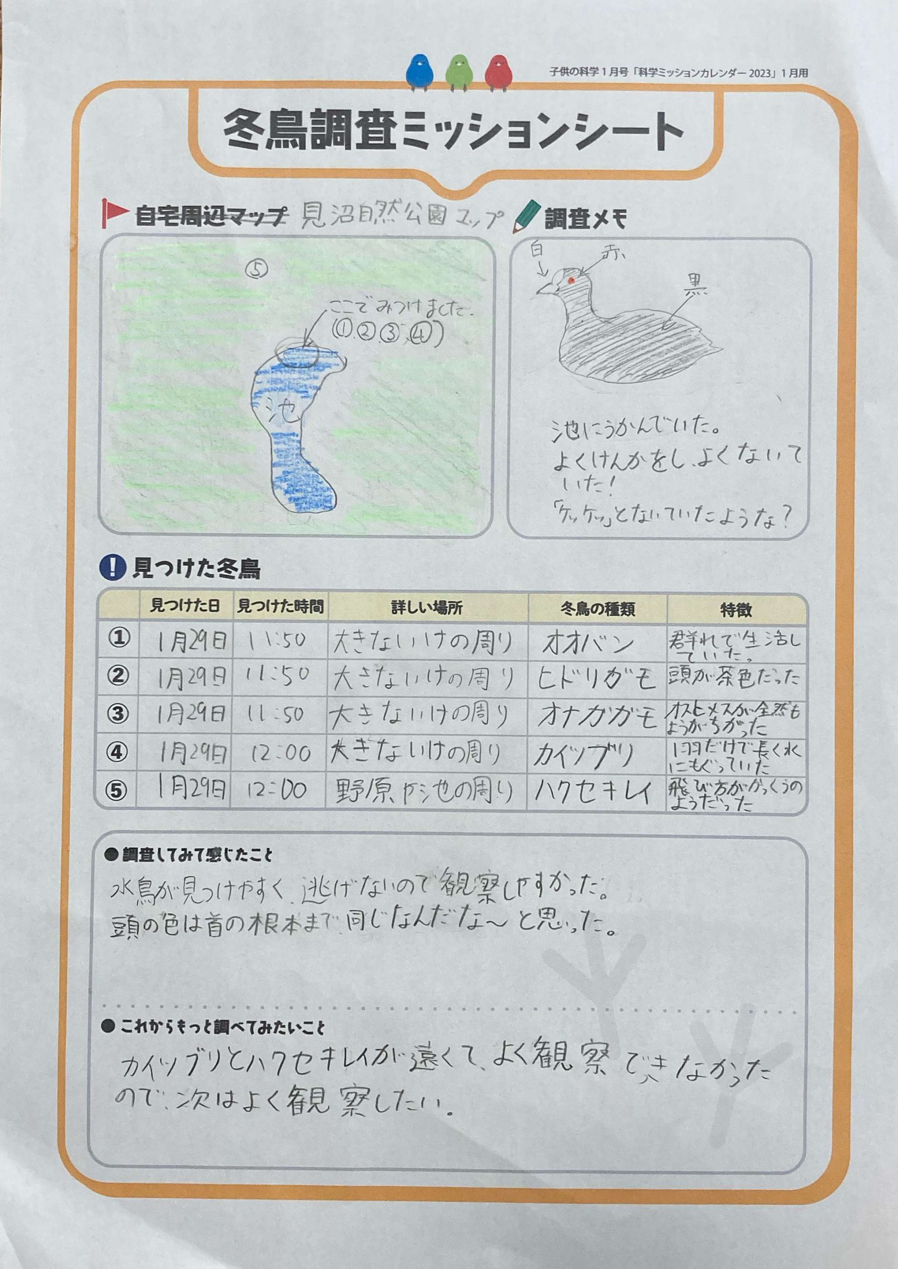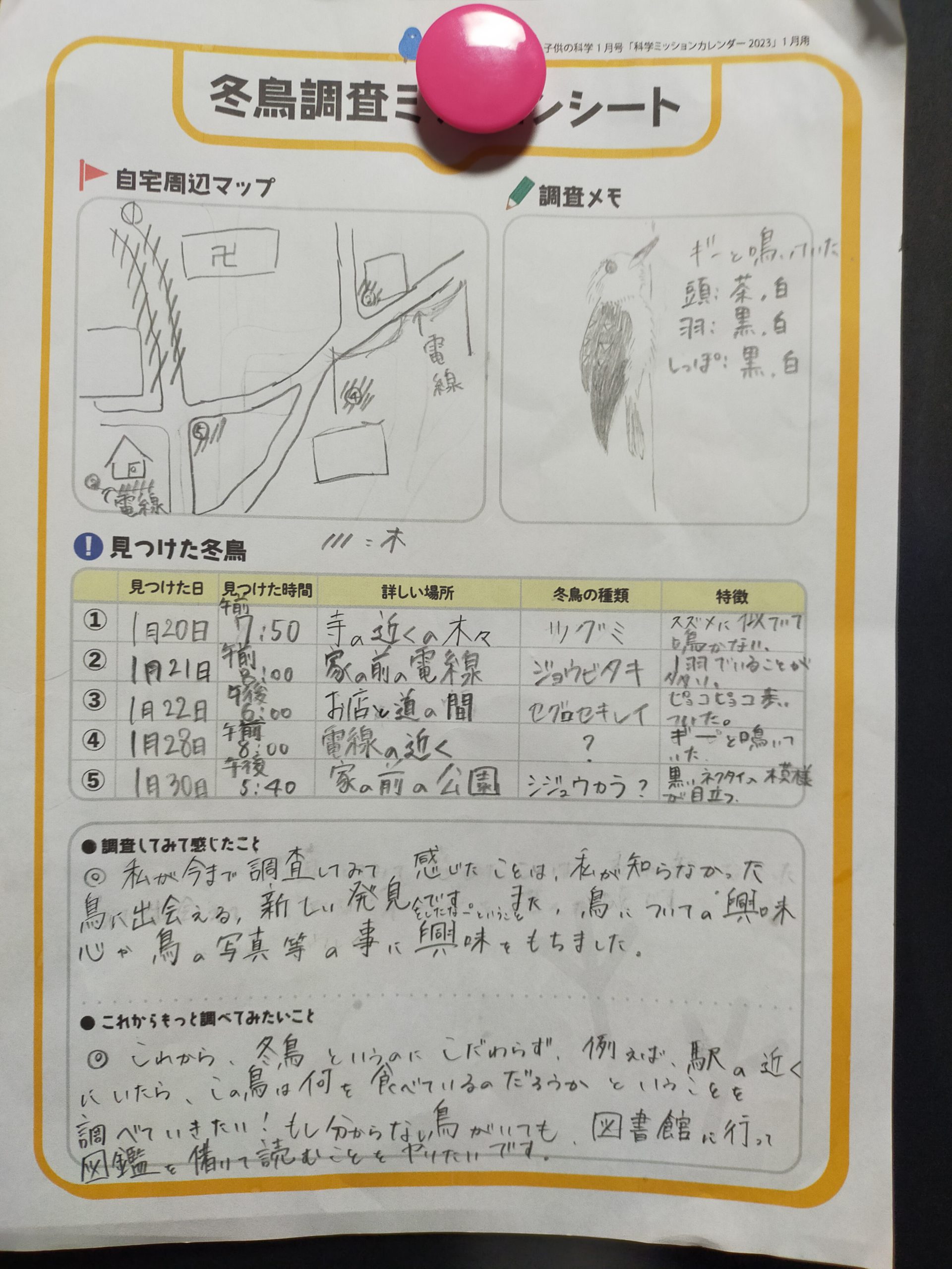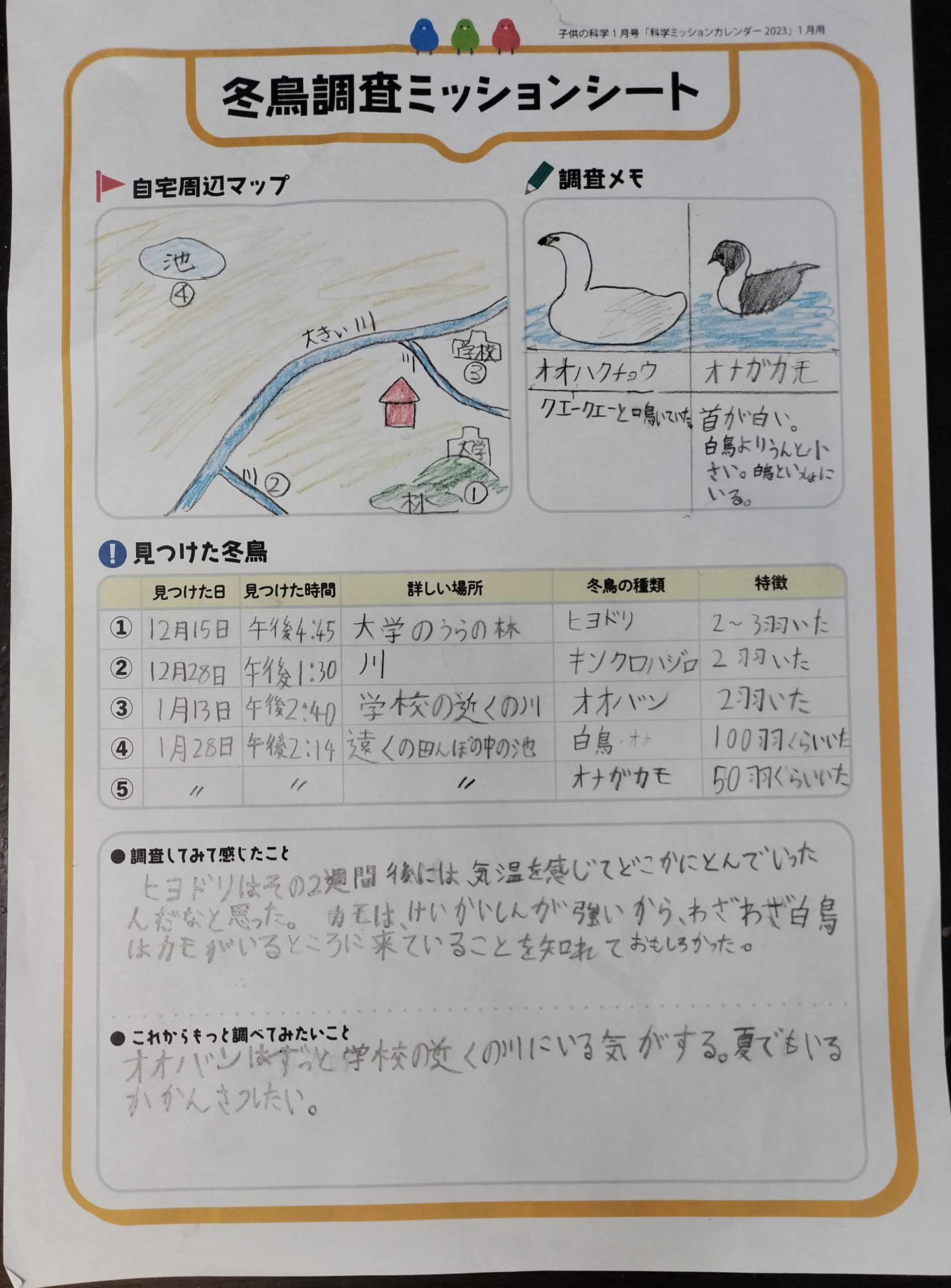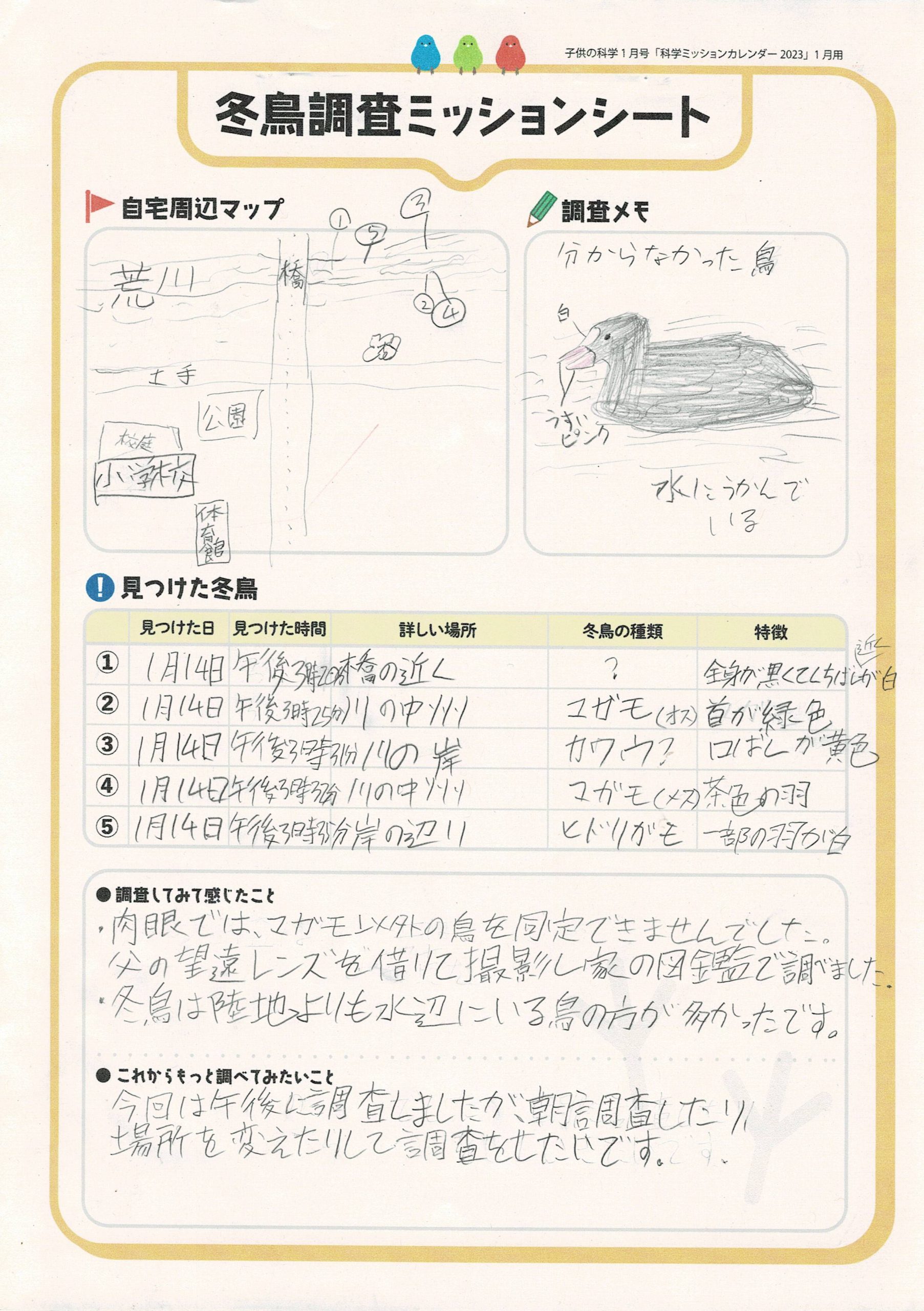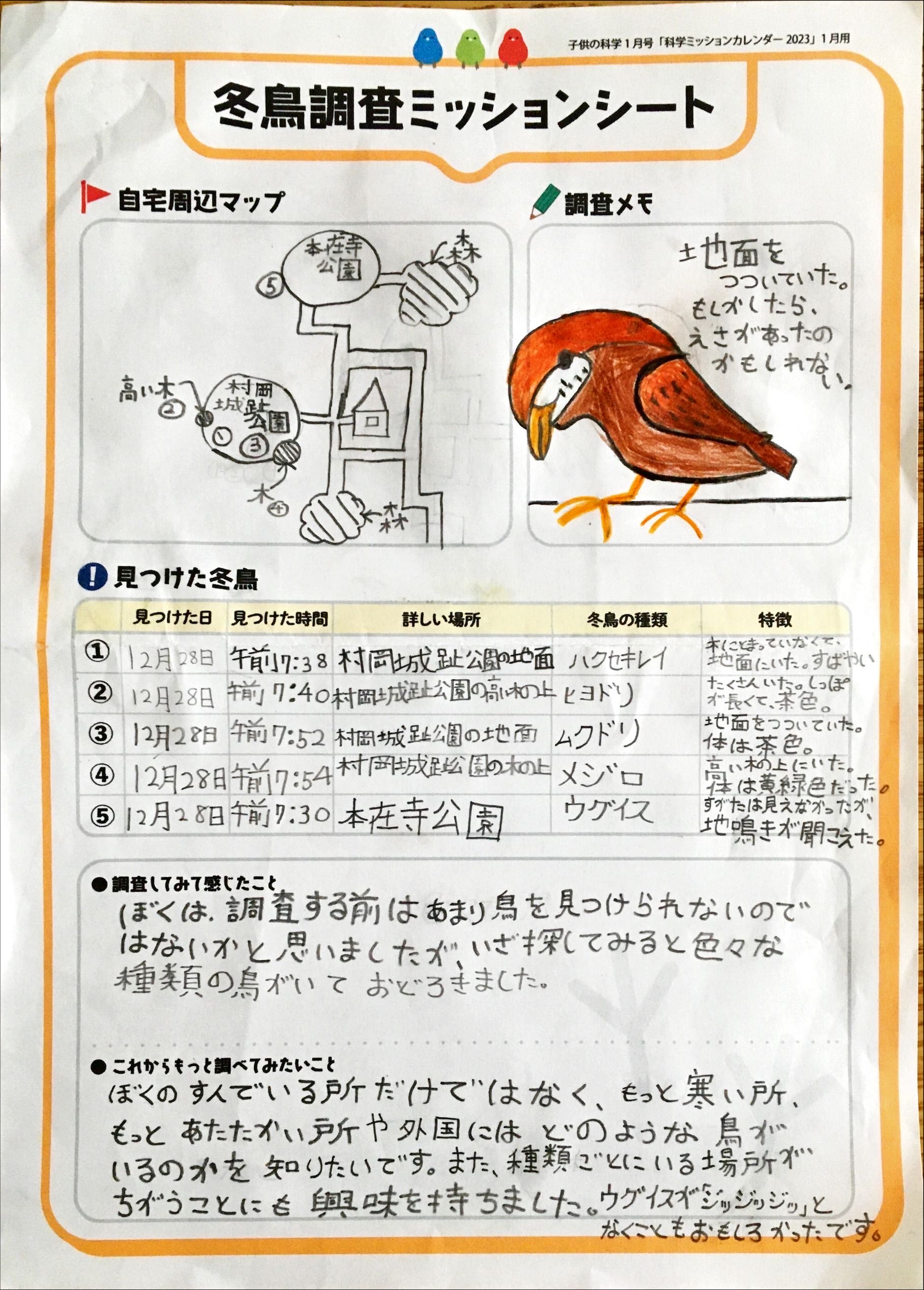 子供の科学2023年1月号別冊付録「科学ミッションカレンダー」1月のミッションは「家の近くで冬鳥を探そう」。この報告が編集部にたくさん寄せられました! 子供の科学2023年5月号でも少し紹介していますが、ここでも見ごたえのあるものをいくつか紹介します。高木先生からのコメントもチェックしてね!