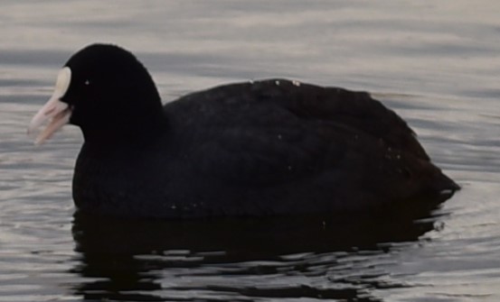 ・体が全部黒く、薄ピンクくちばしで、オデコが白い鳥ですね。オオバンです。カモではないですが、水に浮かんでいますね。よく陸に上がって餌をとるので、そのときに足を観察してみてください。おもしろい形をしていると思いますよ。