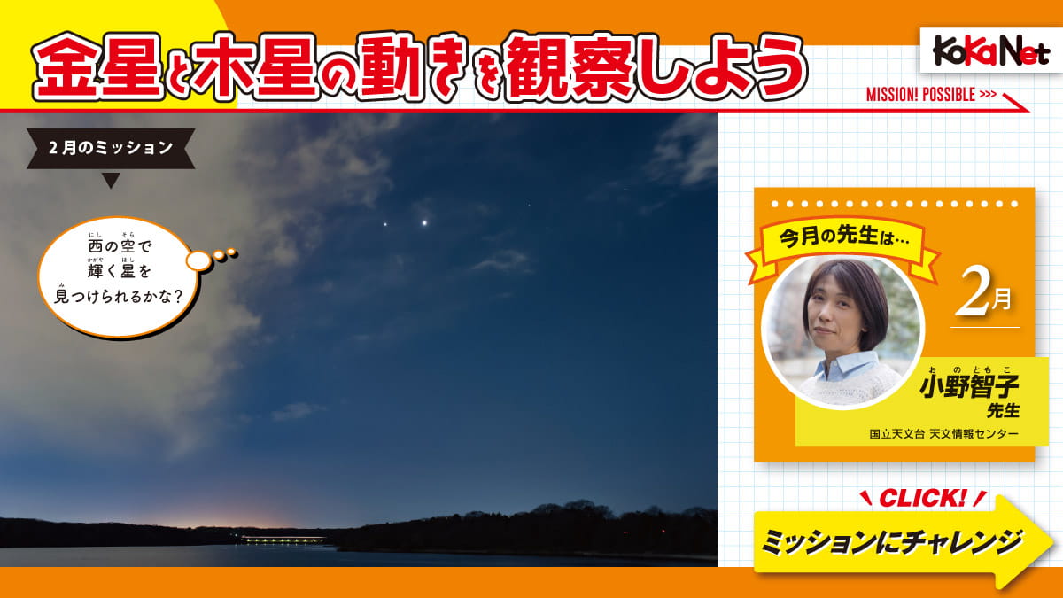 子供の科学2023年1月号別冊付録「科学ミッションカレンダー」2月のミッションページ。小野先生からみんなに送られたミッションは、「金星と木星の動きを観察しよう」。今年の2~7月ごろは金星がとても明るく見やすいのだそう。目当ての星をどうやって探し、どうやって記録するといいか教えてもらったよ。以下の解説を読んでから観察をスタートしよう!