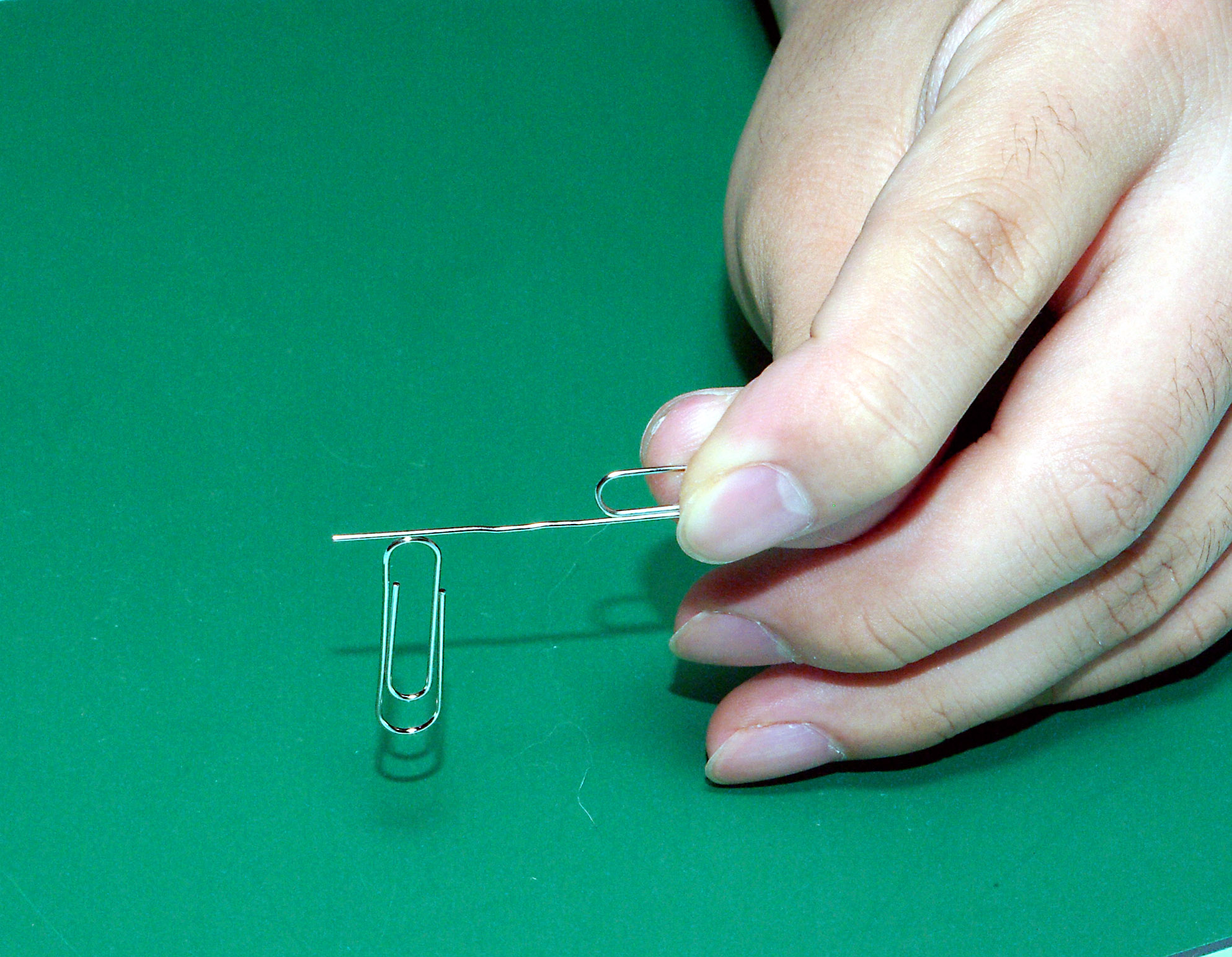 1:ゼムクリップの端をのばして「9」の字型にする。