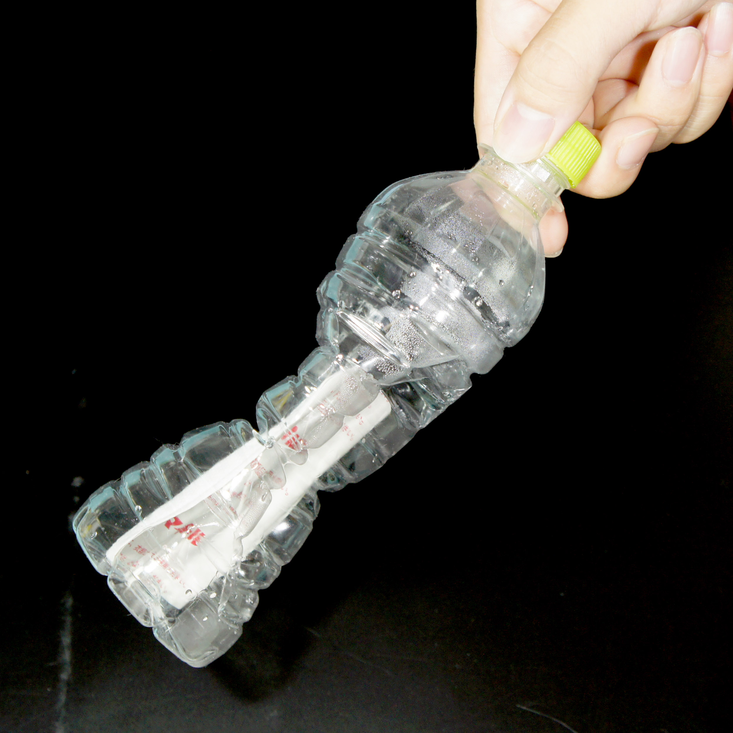 1:飲料水用の柔らかいペットボトルに、使い捨てカイロを細くまるめて押し込む。