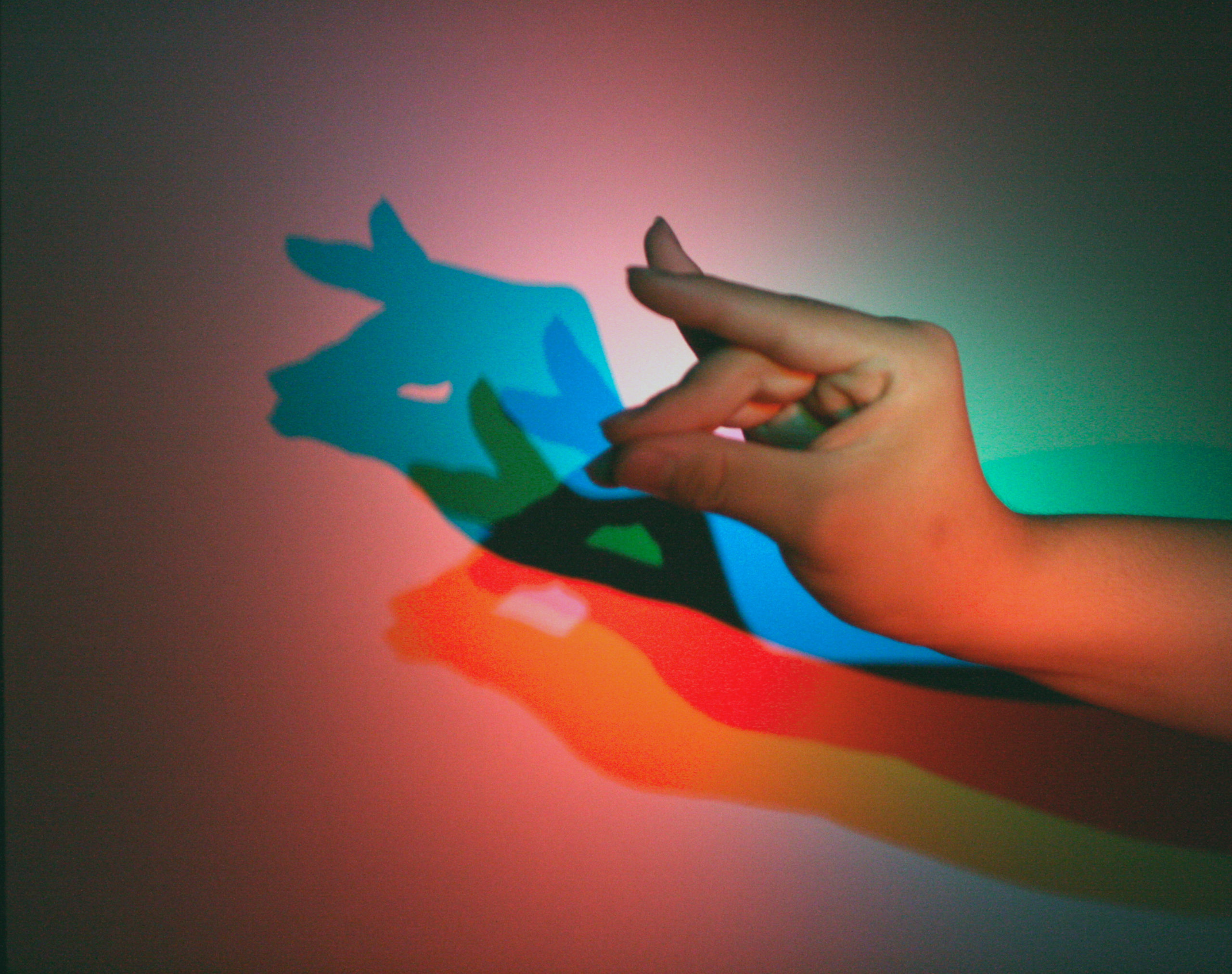 2:懐中電灯とスクリーンの間に影になるもの(手やものなど)を入れると影ができるが、影の重なりあった部分にさまざまな色が現われる。