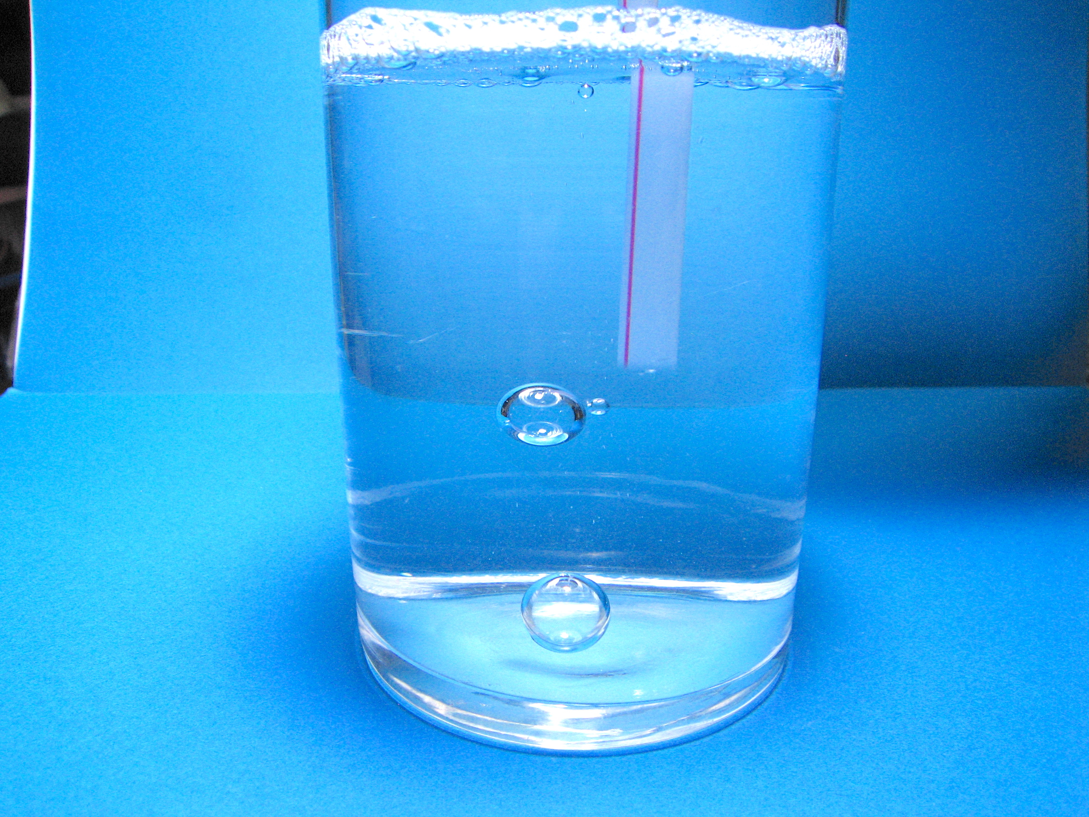 中性洗剤に含まれる界面活性剤は、水の表面張力を弱めて水面が広がりやすくする(このため水が膜になりやすくなるのでシャボン玉がつくれる)。液を水中に落とすと空気もいっしょに水中に入るが、ふつうは水の表面が縮まる力(表面張力)が強いので、空気だけが泡になって浮かび上がる。表面張力が弱いと水の表面があまり縮まらないので、落ちた水滴のまわりに空気が広がった「空気の膜」の玉になって、ゆっくりと浮かび上がる。