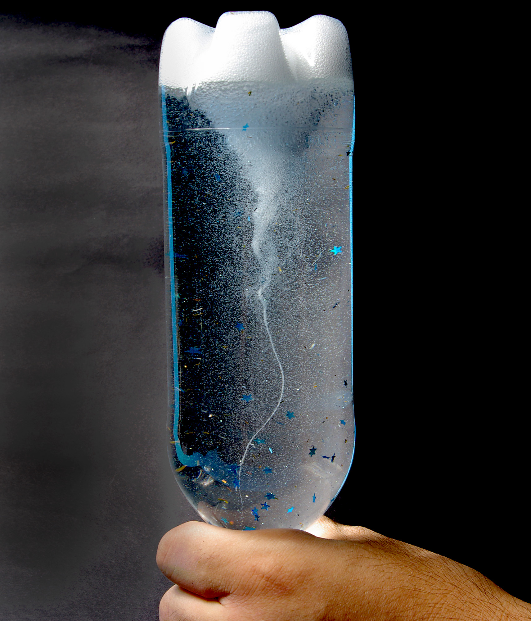 3:ボトルの底を持って全体をぐるぐる振り回して止めると、水中に渦ができて竜巻のような形が見られる。