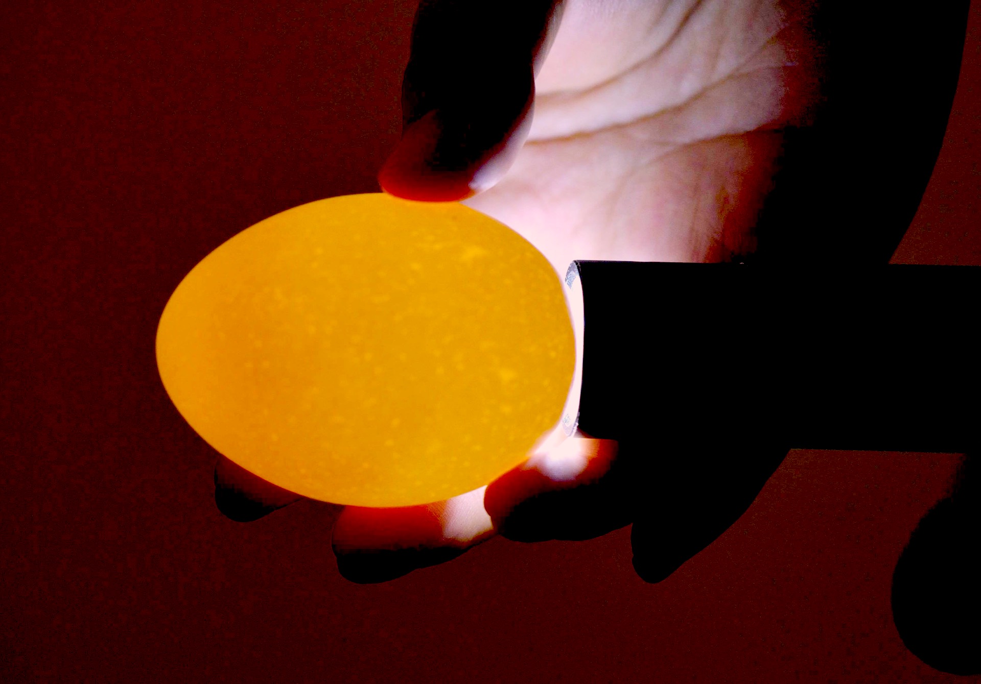 2:まわりを暗くして、卵に懐中電灯の先を当てて灯す。