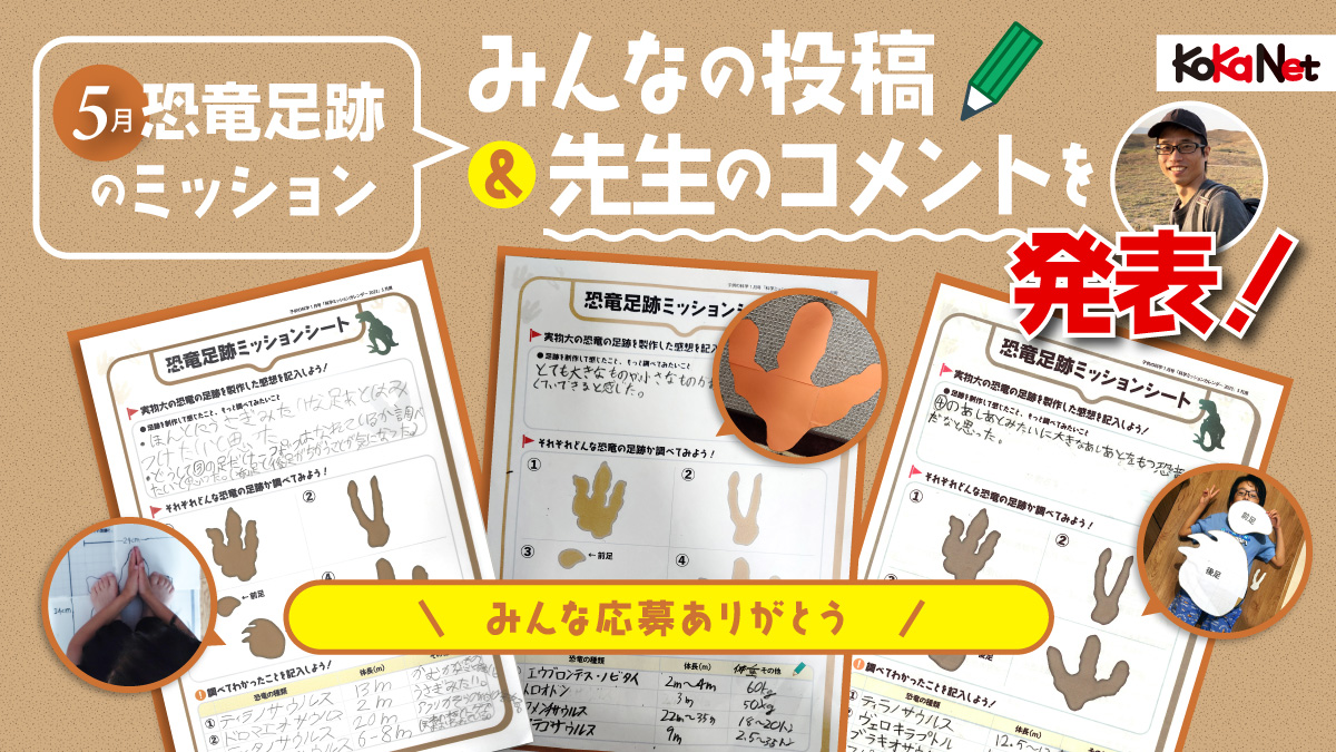 ・恐竜足跡ミッションシートを通して、さらに疑問が出てきたのですね。科学者としてすばらしいです。今回のミッションにはアンキロサウルスやステゴサウルスの足跡はなかったけれど、どういう足跡をしていたと思うかな。図鑑や博物館で、自分なりに考えてみよう!