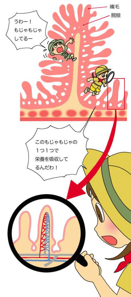 絨毛の表面には食べ物の栄養分を細かくするための消化酵素と呼ばれる物質がたくさんくっついています。栄養分はその消化酵素に触れることで細かく分解されます。私たちが食べた栄養分は細かく分解されるからこそ吸収されやすくなります。