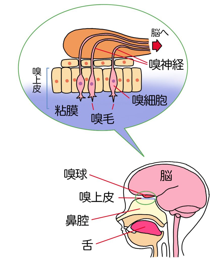 )があります。ここににおいの元になる物質が触れると、その情報が神経を伝って脳(嗅球とそこから続く脳の一部)に送られます。すると私たちは「においを感じる」ことができるのです。