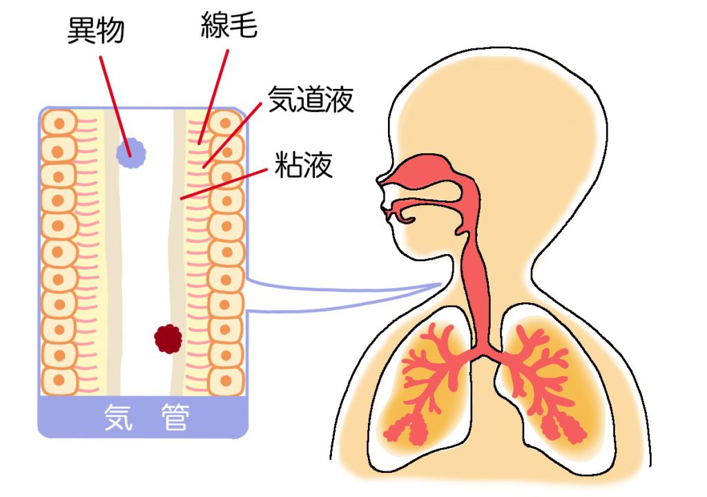 鼻の孔の奥に、たくさんの毛が生えているのが見えるかな? これ、鼻毛(はなげ)と普段はいうけれど、正式には鼻毛(びもう)といいます。鼻の孔のさらに奥には、ネバネバした液体(粘液)と線毛とよばれる鼻毛よりさらに細い毛がたくさん生えていて、それらが鼻の奥にある「のど」や、そのまた奥にある「気道」の表面を覆っています。それらのおかげで、吸った空気中に含まれるホコリ、チリ、ばい菌などは体の奥に入っていきにくくなります。