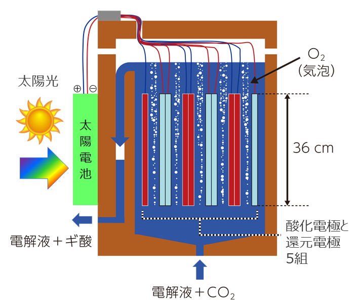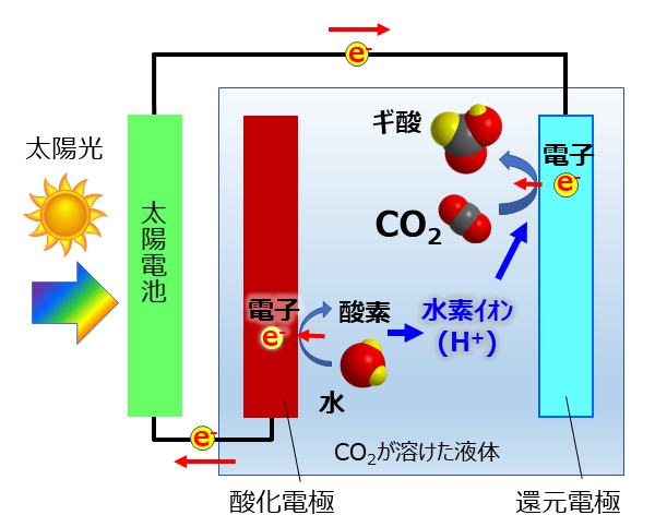 現在の多くの人工光合成では電力ではなく、このギ酸を効率的につくる技術が研究されており、今回のシステムもギ酸を生成します。まず、太陽電池で太陽光を受け止めて電力を発生させ、これを二酸化炭素を含む水溶液の中に置いた電極に流します。電力によって水が電気分解して酸素と水素イオンが発生し、水素イオンが二酸化炭素と結びついてギ酸を生成するしくみです。