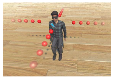 実験参加者には胸にバイブレーターをつけてもらい、バイブレーターが作動したときの触覚刺激をできるだけ早く検出するように、という課題を与えました。バイブレーターによる触覚刺激が起こるタイミングについては、周囲を移動する音の位置や動きがさまざまな場合を設定しました。なお、実験参加者には目隠しをしてもらい、聴覚と触覚以外の情報を遮断しました。