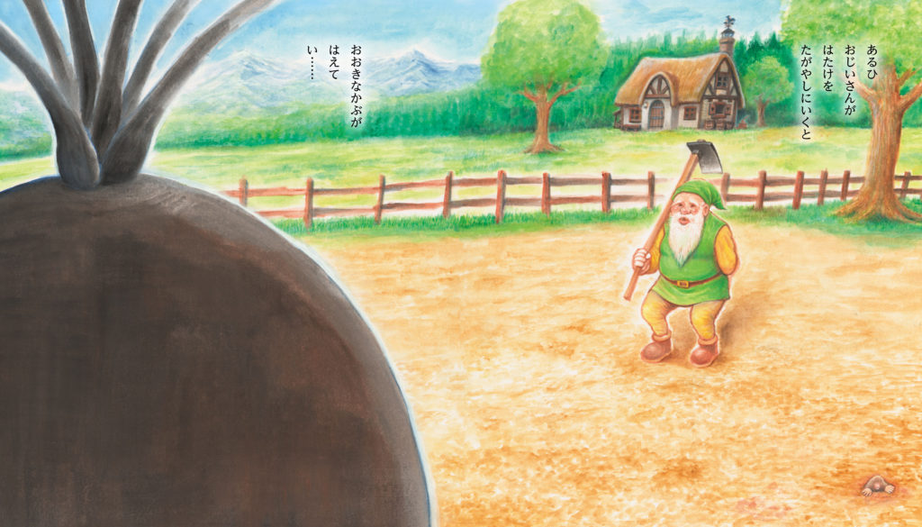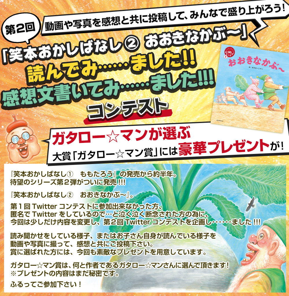 大大大好評!の『ももたろう』に続く、漫☆画太郎こと「ガタロー☆マン」作、笑本(えほん)おかしばなしシリーズ第2弾!!! ガタロー☆マンが今回描くお話は「おおきなかぶ(~)」? 今作ももちろん、大人も子どもも思わずにっこり、そして繰り返し読みたくなる「笑本」に仕上がり……ました!!! 可愛らしいキャラクターたちが繰り広げるドタバタをお楽しみください!」。2021年7月20日発売。1320円(税込)