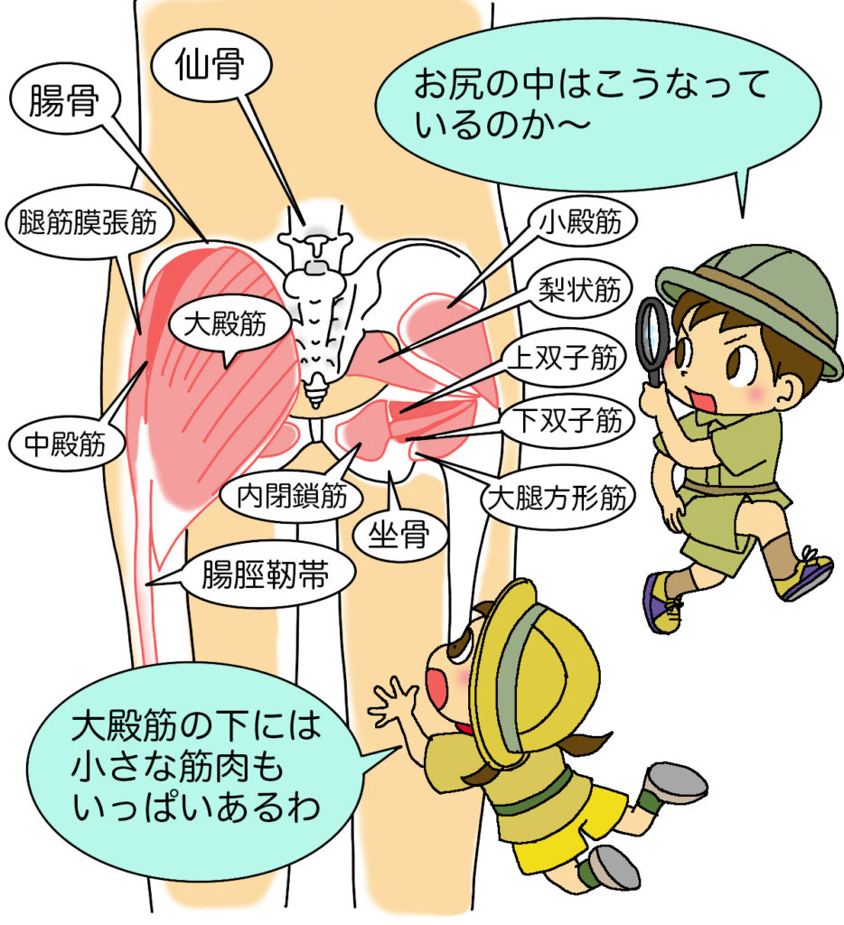 お尻には脂肪以外に筋肉や骨もあって、腰と一緒に体を支えています。お尻の中には、大殿筋という大きな筋肉、そして坐骨と腸骨、仙骨と尾骨という骨があって、これらがお尻を丈夫なつくりにしています。