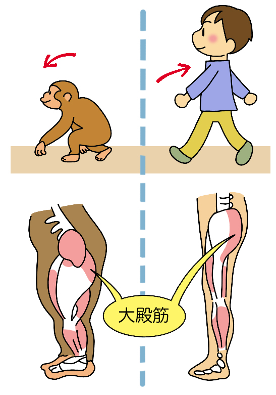 私たち人類は二足で歩くことができるおかげで、歩くときにもともと前足であった手が自由に使えます。こうして、歩きながら物をつかむといった高度な作業を行うことができるようになりました。お尻の中にある筋肉、本当に大切ですね。