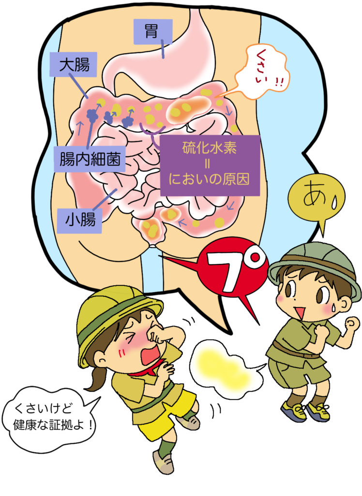 「胃と腸」のお話のときに出てきた腸内細菌叢を思い出しましょう。そう、約100兆個というすごい数の細菌。この細菌から出るガスと、食べ物から発生する臭いにおいが混ざったもの、正確には硫化水素やインドール、スカトールというガスがオナラのにおいの原因です。