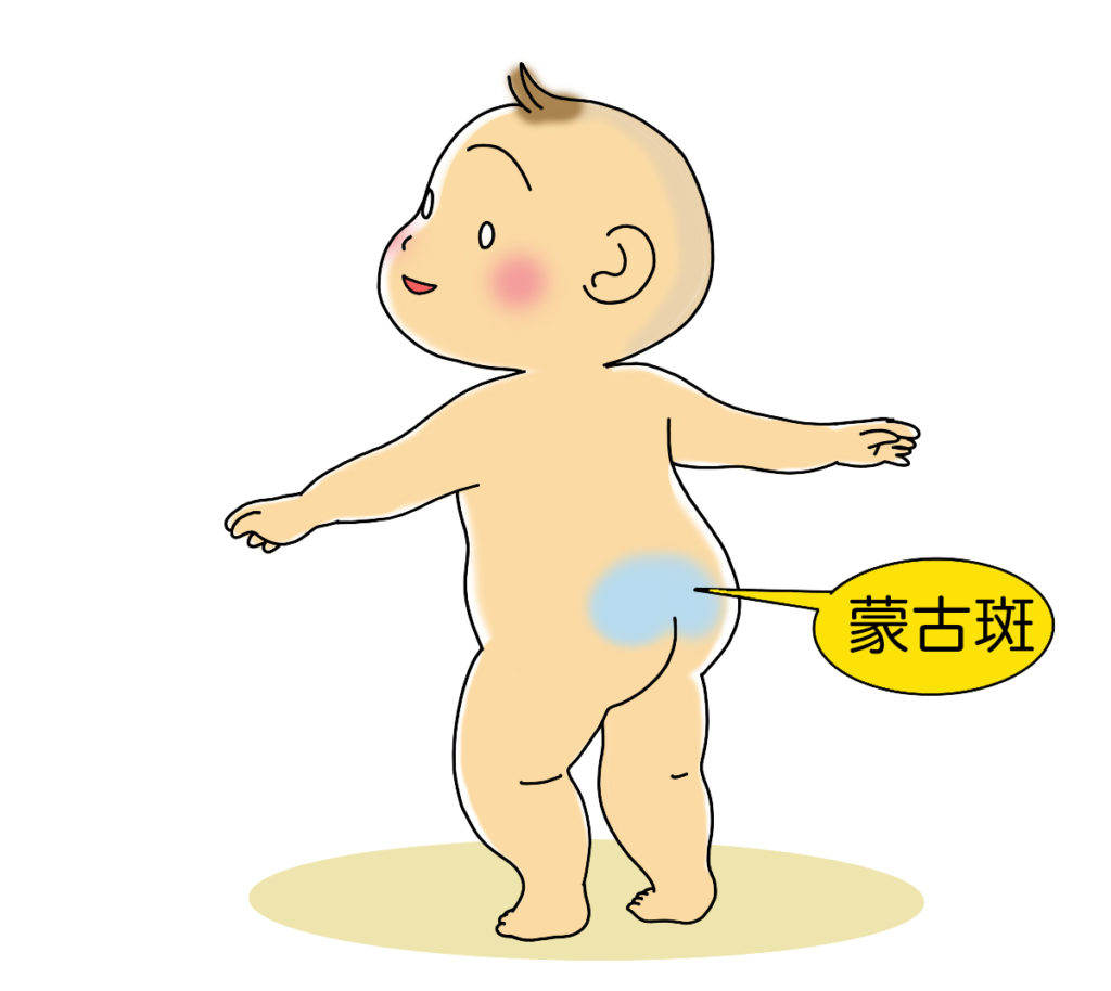 もしかしたら、お尻から背中にかけての辺りに、やや大きい範囲で青い“あざ”があるかもしれませんね。これは、「蒙古斑」といいます。色や大きさ、場所は子供によって異なります。生まれてまもなく、しかも日本人のほとんどの子供に現れるあざです。