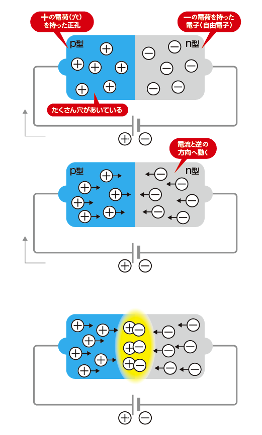 半導体は、電気を流せる導体と電気を流せない絶縁体の中間の性質をもち、外部から電圧や磁力を加えることで電気を流したり、流せなくしたりできます。LEDに使われている半導体は、マイナスの電子によって電気が流れる「n型半導体」と、電子を受け取るプラスの穴(これを「正孔
