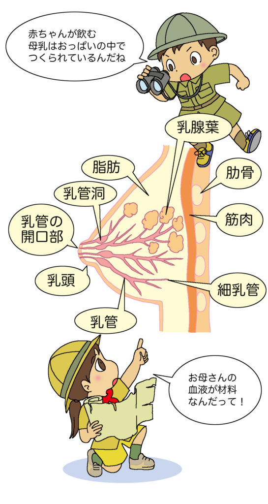 では、おっぱいは何のためにあるのでしょう。そう、赤ちゃんにミルクをあげるためですね。赤ちゃんを産むのはお母さんで、お父さんではありません。赤ちゃんを産んだお母さんのおっぱいから、あら不思議! ミルク(正しくは母乳)がたくさん出て、赤ちゃんは母乳を飲んで育ちます。生まれたての赤ちゃんは歯がないし、お腹の内臓もまだ十分にはたらいてないから、形のある食べ物は食べられない。そこでお母さんの母乳が赤ちゃんにとっての大切な栄養源になるわけです。