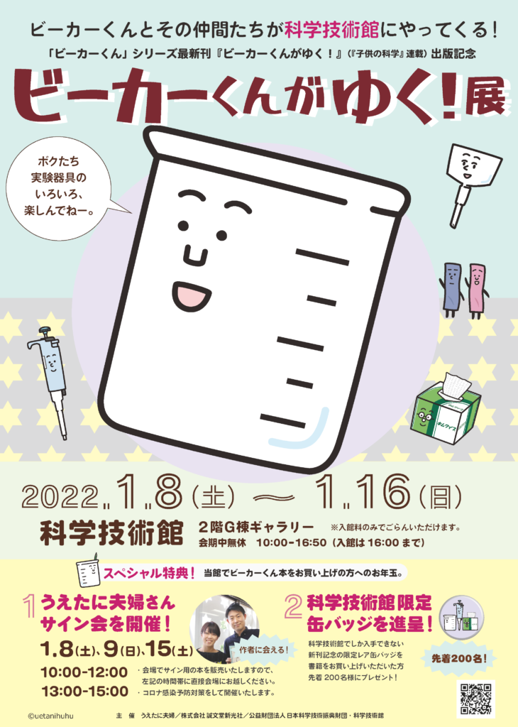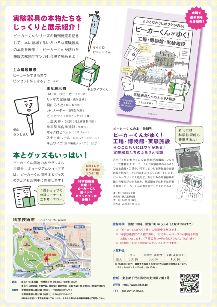 本書の刊行を記念して、この書籍の中でビーカーくんが訪問している科学技術館にて、企画展「ビーカーくんがゆく!展」を開催。本に登場するさまざまな実験器具の実物やマンガのパネル展示、本の先行販売を行います。