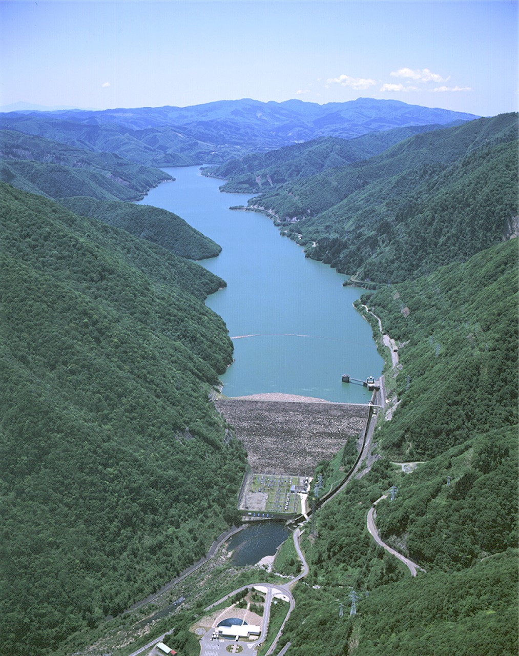 ダム・発電所の風景。発電施設の向こうには、雄大なダムと自然が広がる。この地下には、巨大な発電施設が稼働しているぞ!