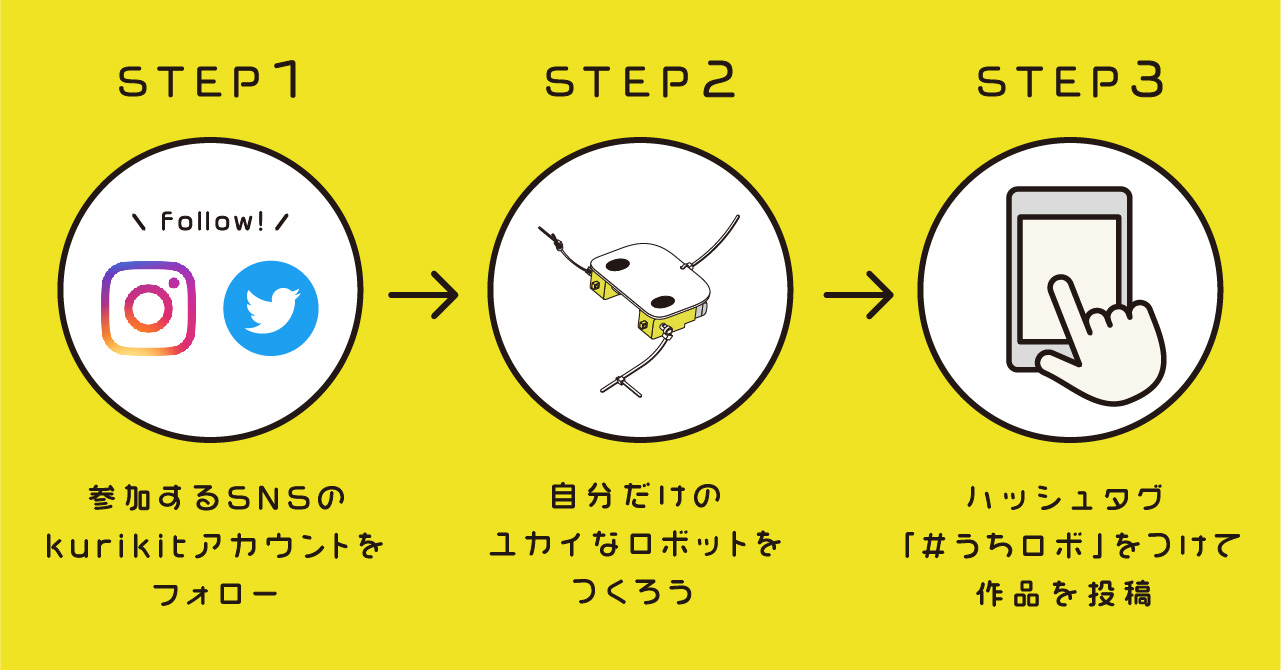 応募はkurikitのSNS(InstagramまたはTwitter)をフォローして、ハッシュタグ「#うちロボ」と、作品名とこだわりポイントをつけて写真や動画を投稿すれば完了! 一人で複数の作品を応募するのもOKだ。