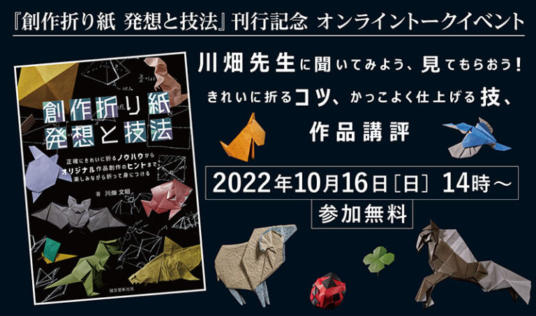 | イベント名 | 『創作折り紙 発想と技法』刊行記念 オンライントークイベント「川畑先生に聞いてみよう、見てもらおう! きれいに折るコツ、かっこよく仕上げる技、作品講評」 |