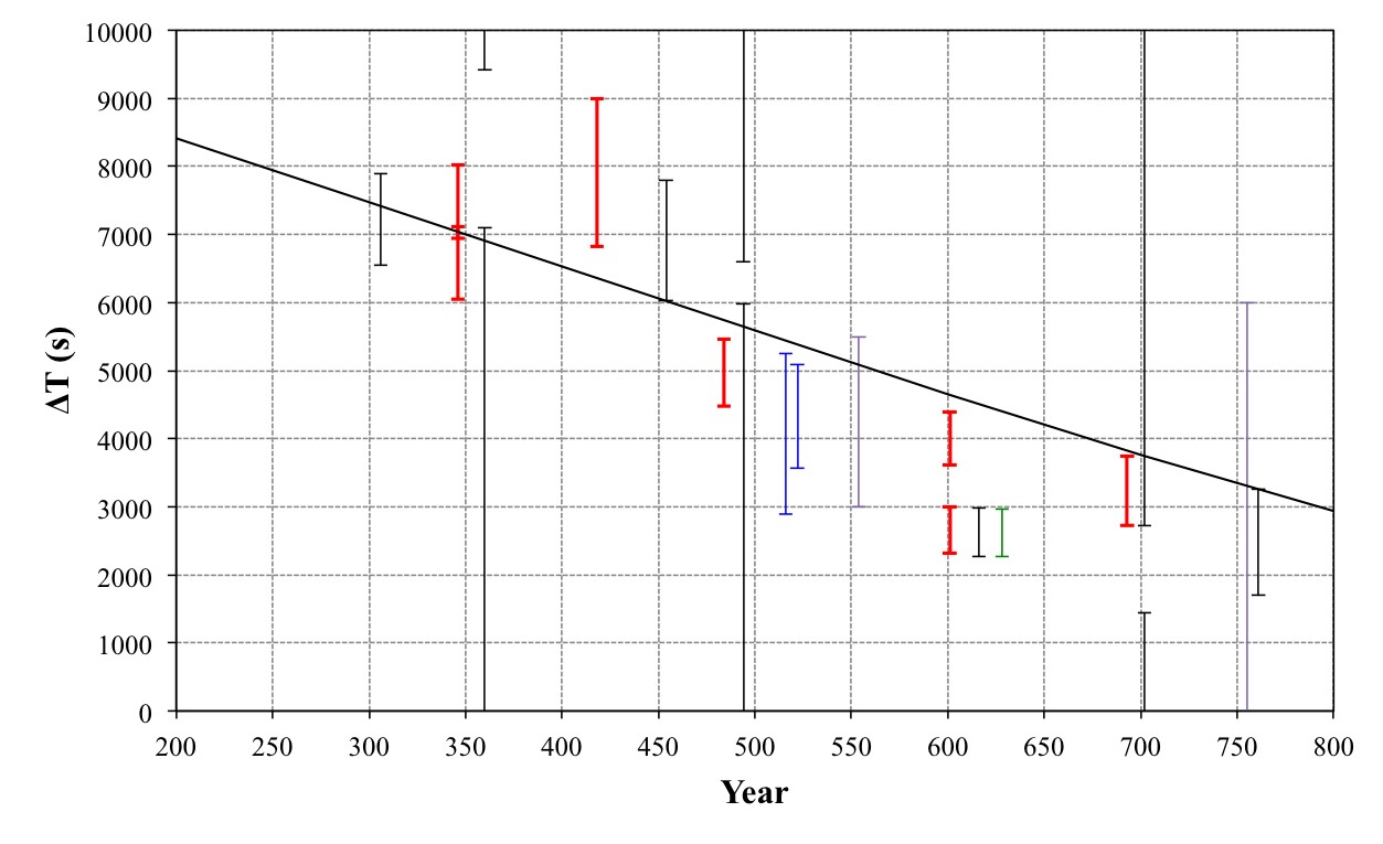 その結果、これまでほとんどわかっていなかった4世紀から7世紀の地球自転速度の精度を上げることに成功しました。また、これまで見つかっていた断片的な日食や掩蔽の記録が正しいものであることもわかりました。これにより、地球の自転速度の減少は、4世紀から5世紀初めにかけてはごく緩やかになり、5世紀中ごろから7世紀にかけて比較的急ペースになるなど、これまで考えられていたよりも不規則だった可能性が示されました。
