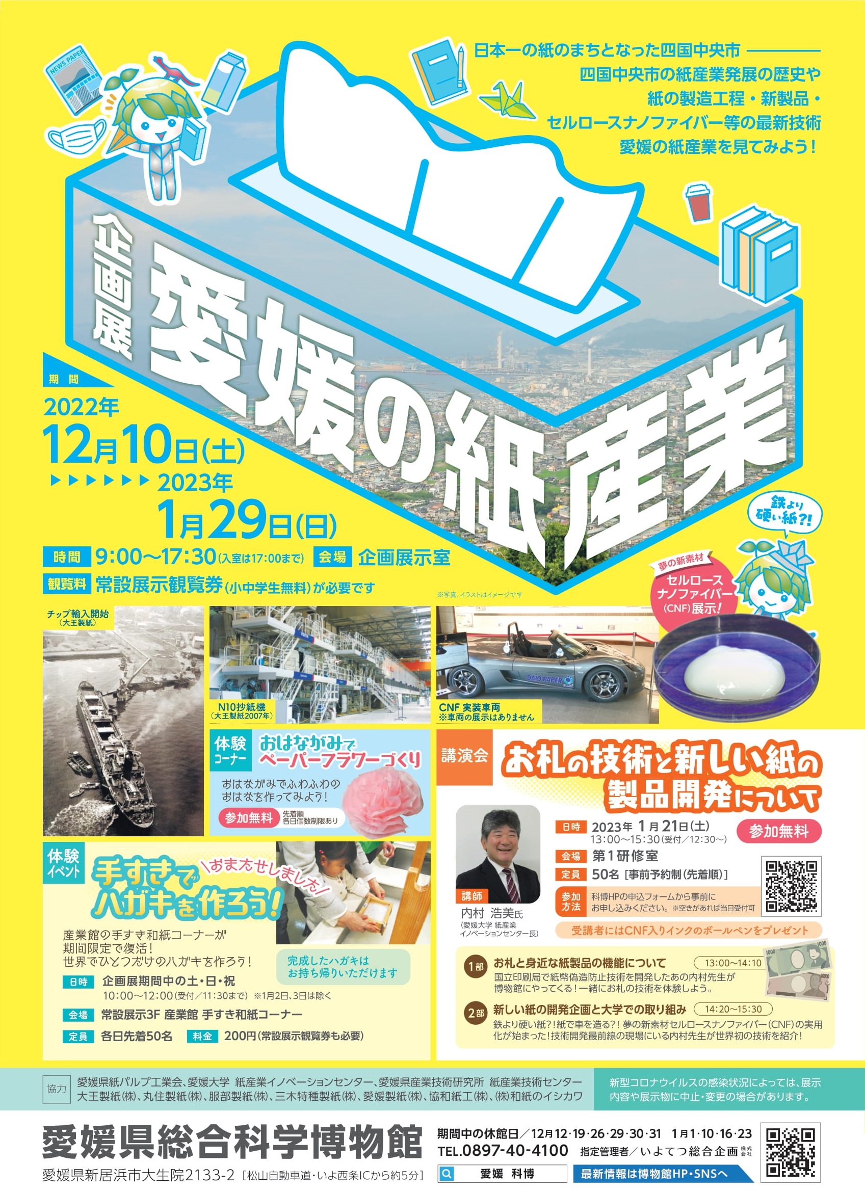 日本を代表する紙のまち・愛媛県四国中央市の紙産業の発展を振り返る企画展が開催中。紙の製造過程からセルロースナノファイバーなどの最新技術まで幅広く解説(鉄よりかたい紙って一体⁉)。身近な紙について、知識を深めちゃおう! 会期中はイベントも開催されるから、詳しい情報は公式サイトをチェックしてね。