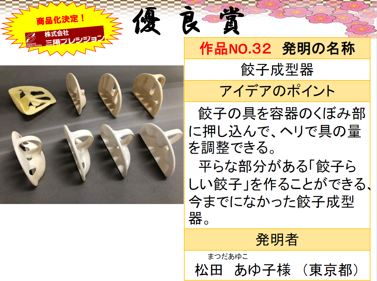 1点目は、優良賞に選ばれた竹田歩美さんの「餃子成型器」という作品。