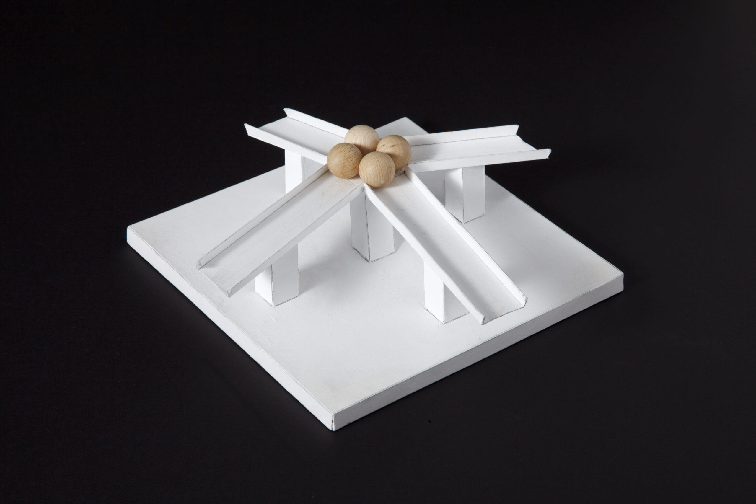上の写真は「何でも吸引4方向すべり台」という作品。4方向の滑り台にボールを乗せると、なんと低い方から高い方にボールが上っていくように見える。
